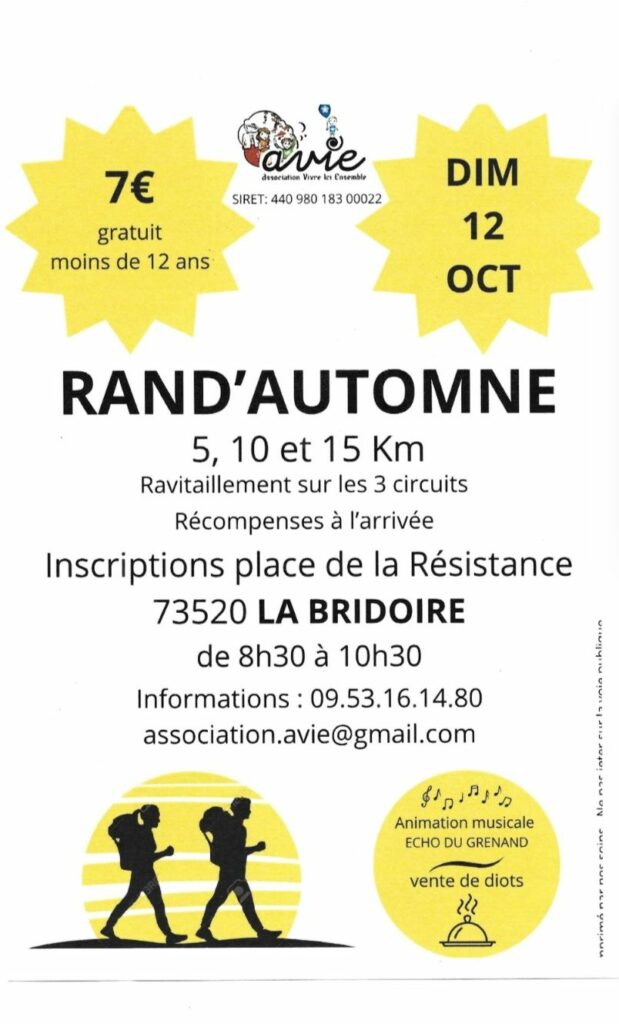 L’association AVIE – Vivre les Ensemble organise le dimanche 12 octobre sa traditionnelle Rand’Automne à La Bridoire (73520).